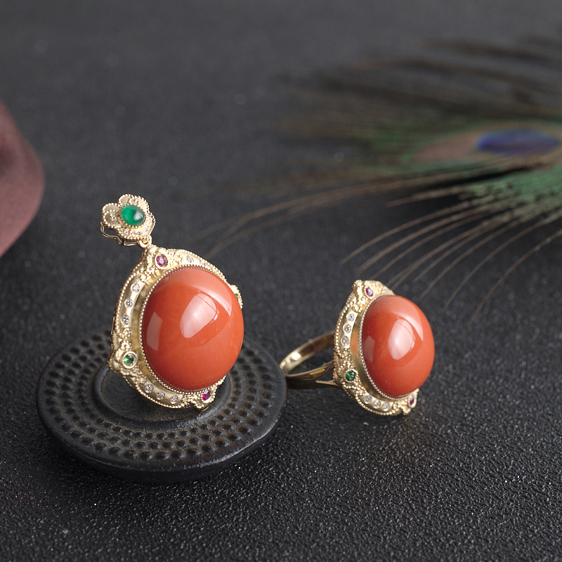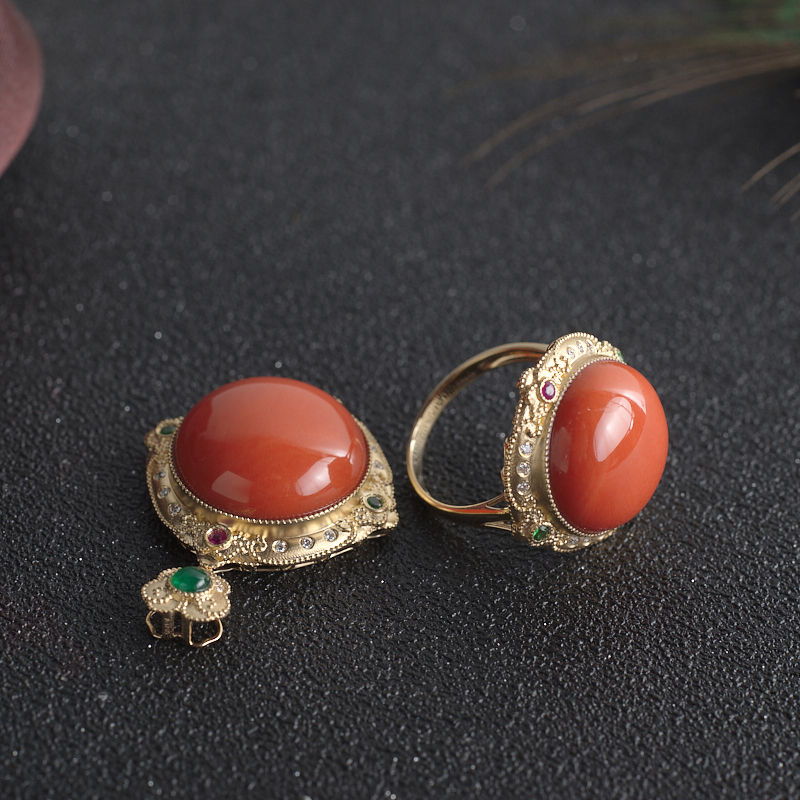 • 18KMOMO珊瑚圆形戒指/吊坠套装