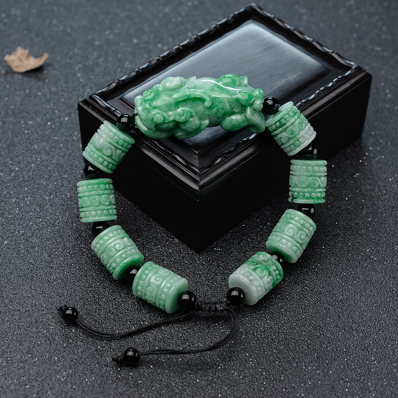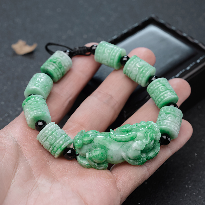• 豆种飘翠翡翠桶珠貔貅单圈手串