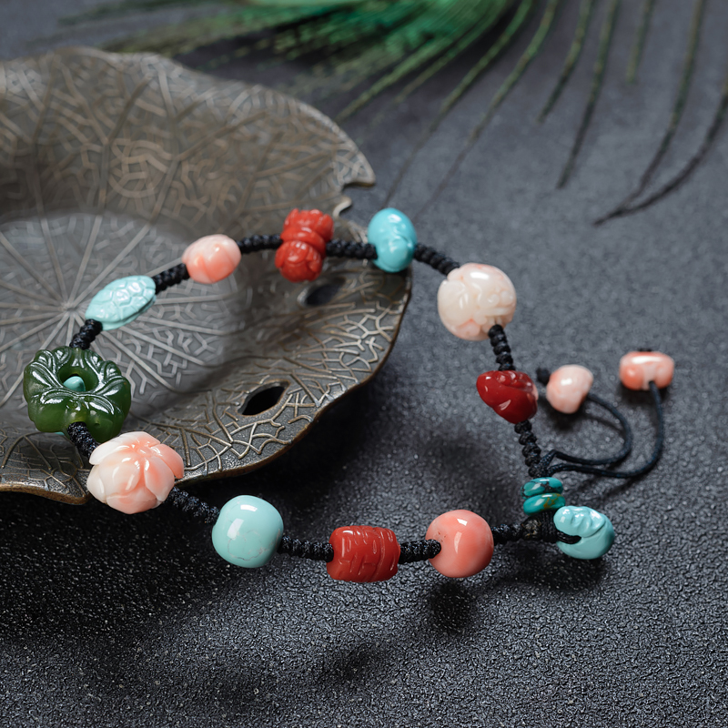 [原料产地] 珊瑚:意大利、台湾; 绿松石:湖北; 碧玉:俄罗斯