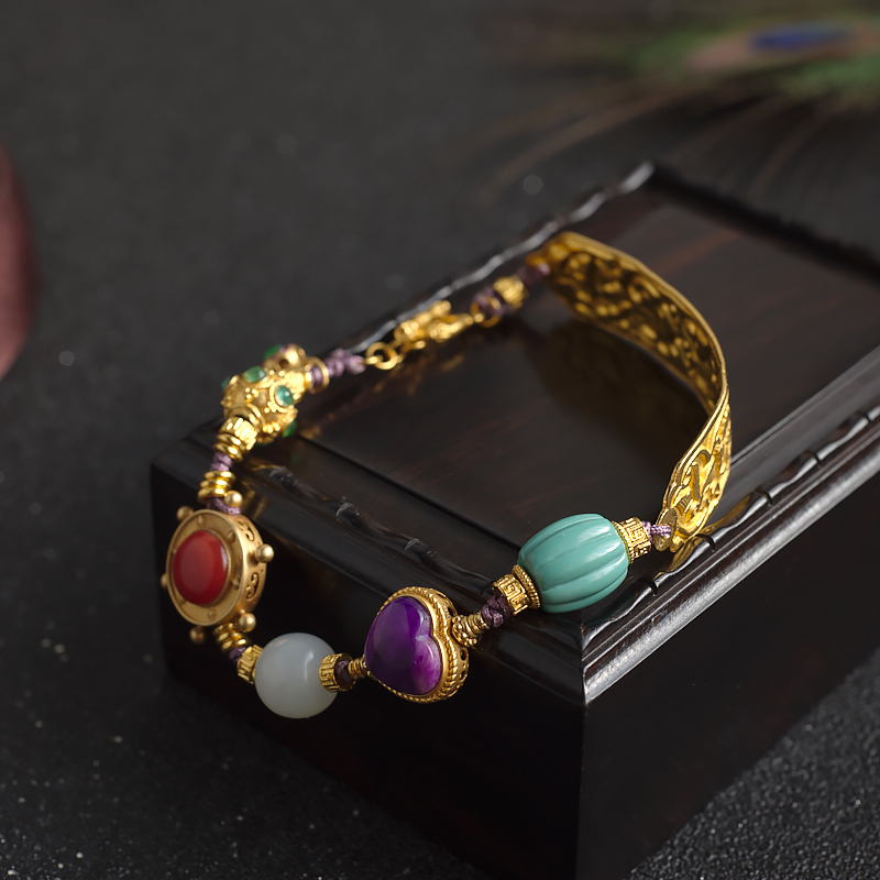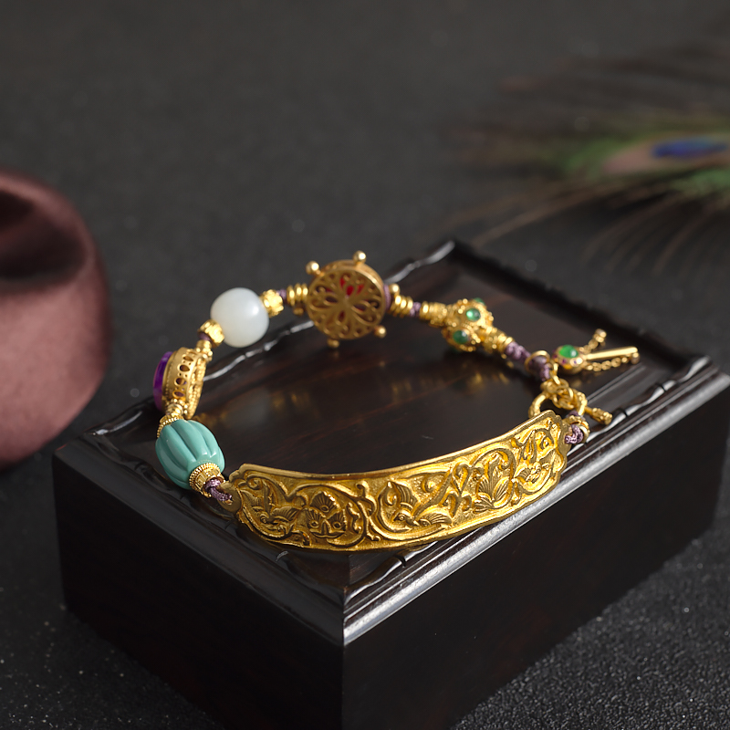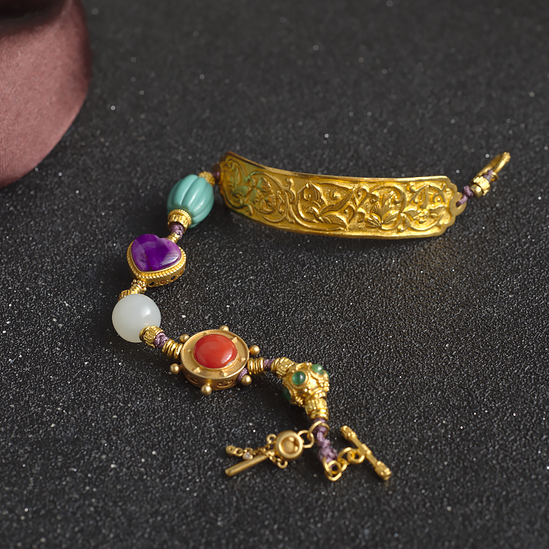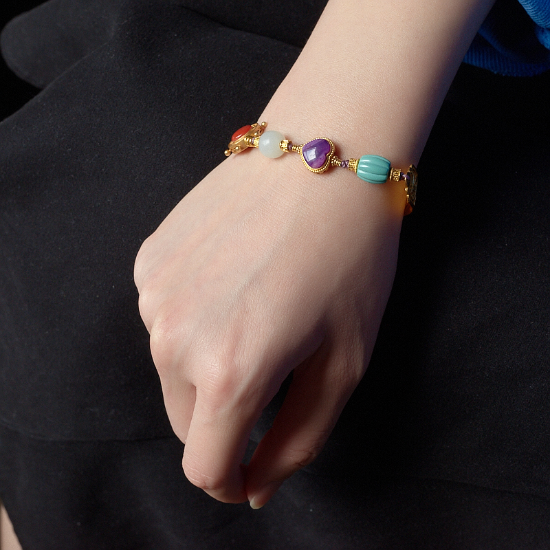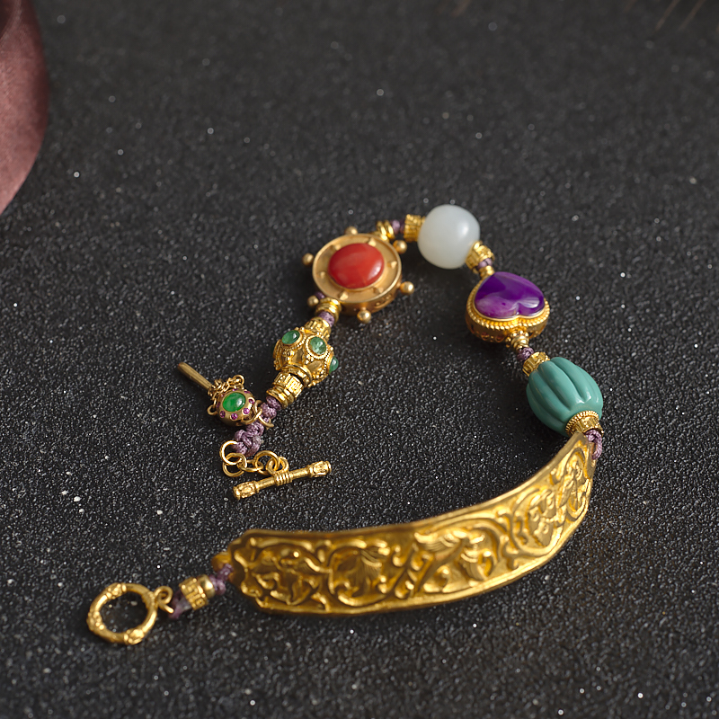 • [产品描述] 配饰:18K金镶祖母绿、翡翠配件、24K金饰、24K扣 珊瑚有虫孔、压力纹。 绿松石珠径8.8mm厚9.4mm,舒俱来总长10.5mm宽11.7mm厚6.4mm主石长8.3mm宽9.5mm厚2.5mm,和田玉直径8.8mm厚7.3nn,珊瑚总长14.9mm宽17.2mm厚5.2mm主石直径7.9mm厚2.3mm,金牌长52.3mm宽12.3mm厚1.3mm,全长17cm