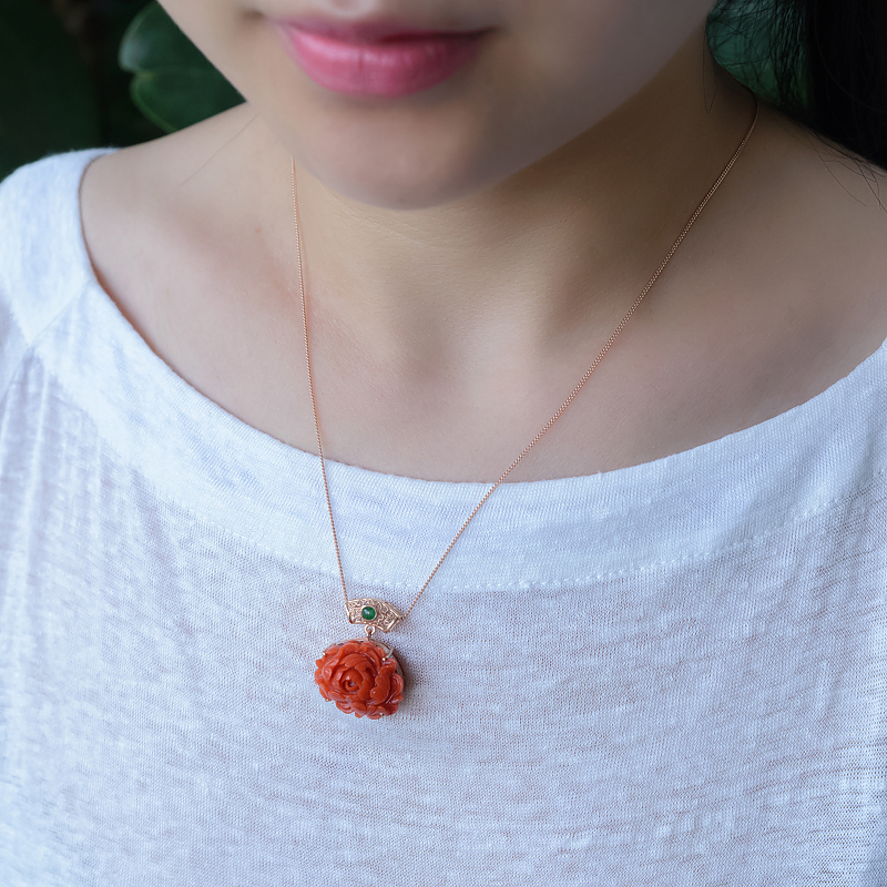 • 18K沙丁珊瑚牡丹花吊坠