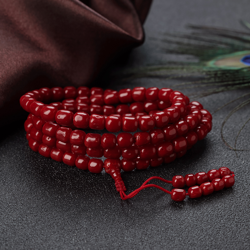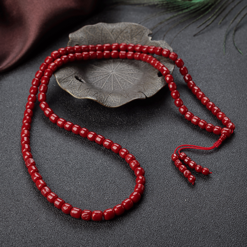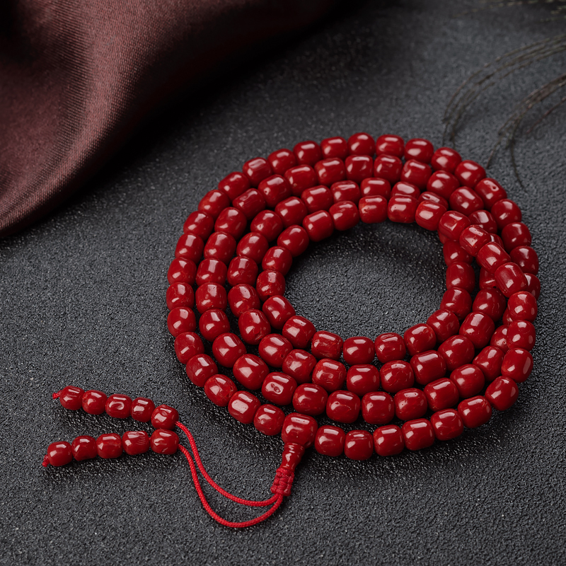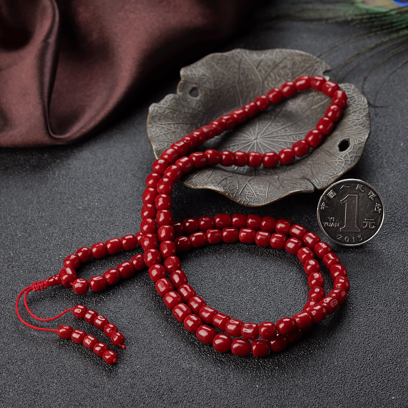 • 沙丁牛血红珊瑚桶珠108佛珠