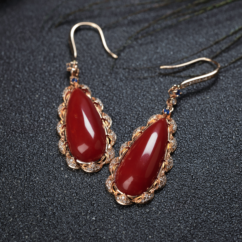 • 18K沙丁牛血红珊瑚水滴耳坠