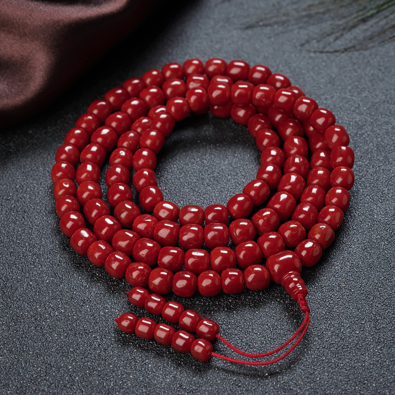 • 沙丁牛血红珊瑚桶珠108佛珠