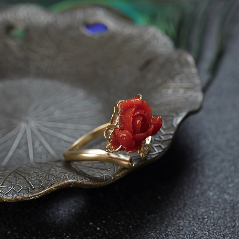 • 18K沙丁珊瑚牡丹花戒指