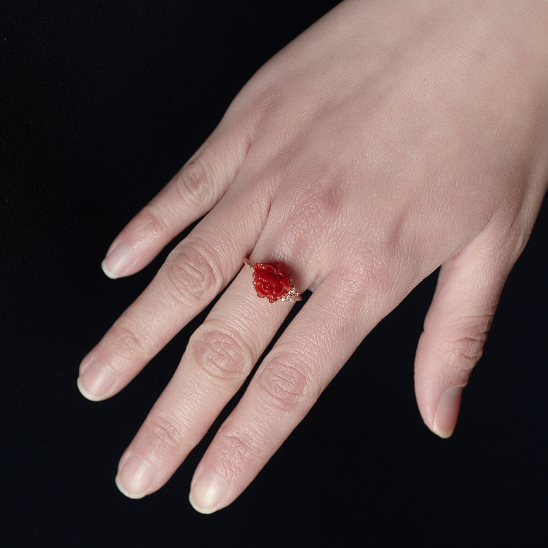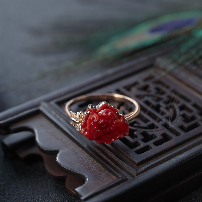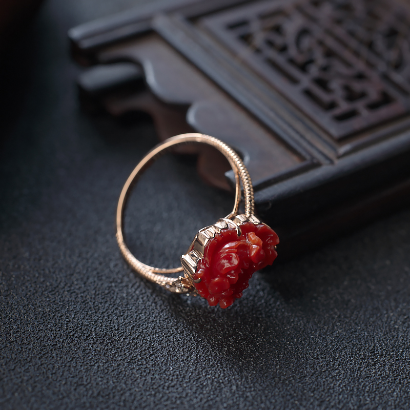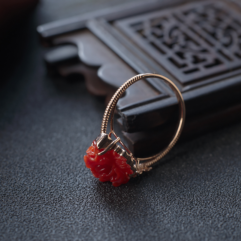 • 18K沙丁牛血红珊瑚花开富贵戒指