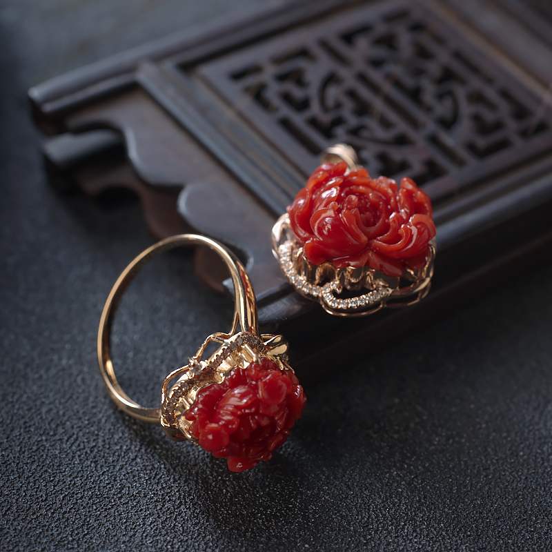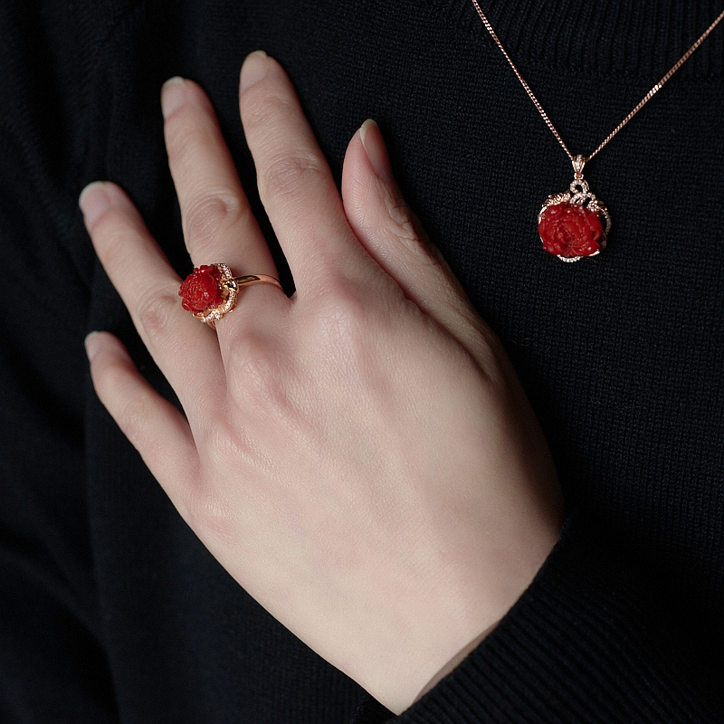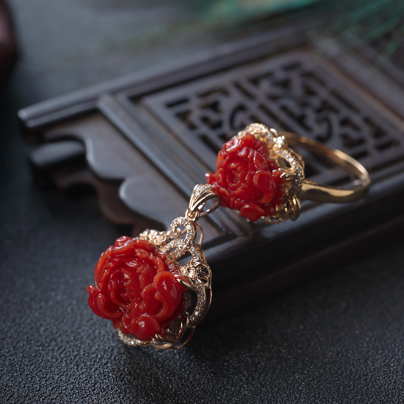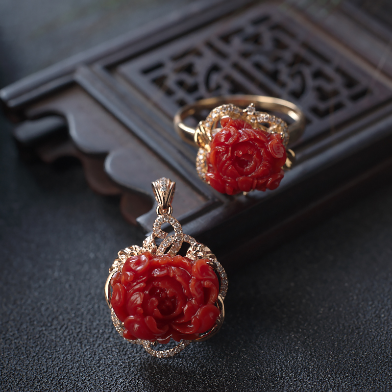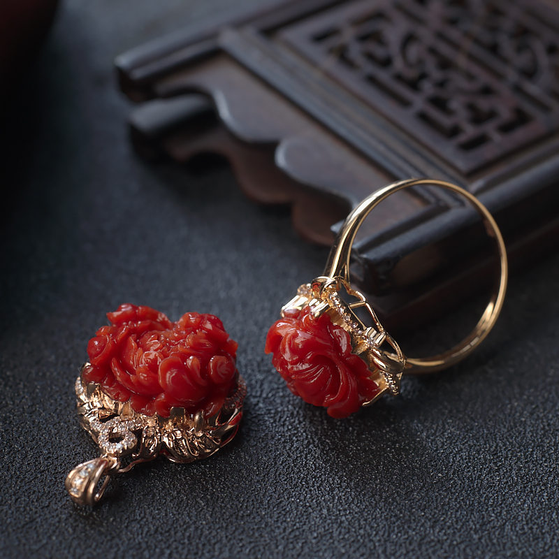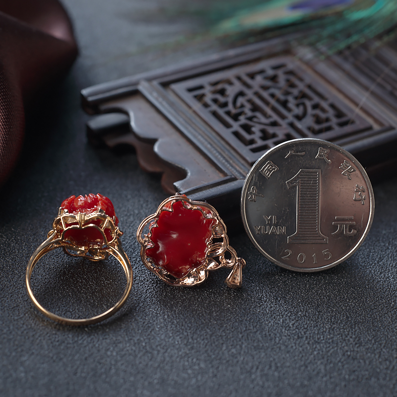 • 18K沙丁牛血红珊瑚花开富贵套装