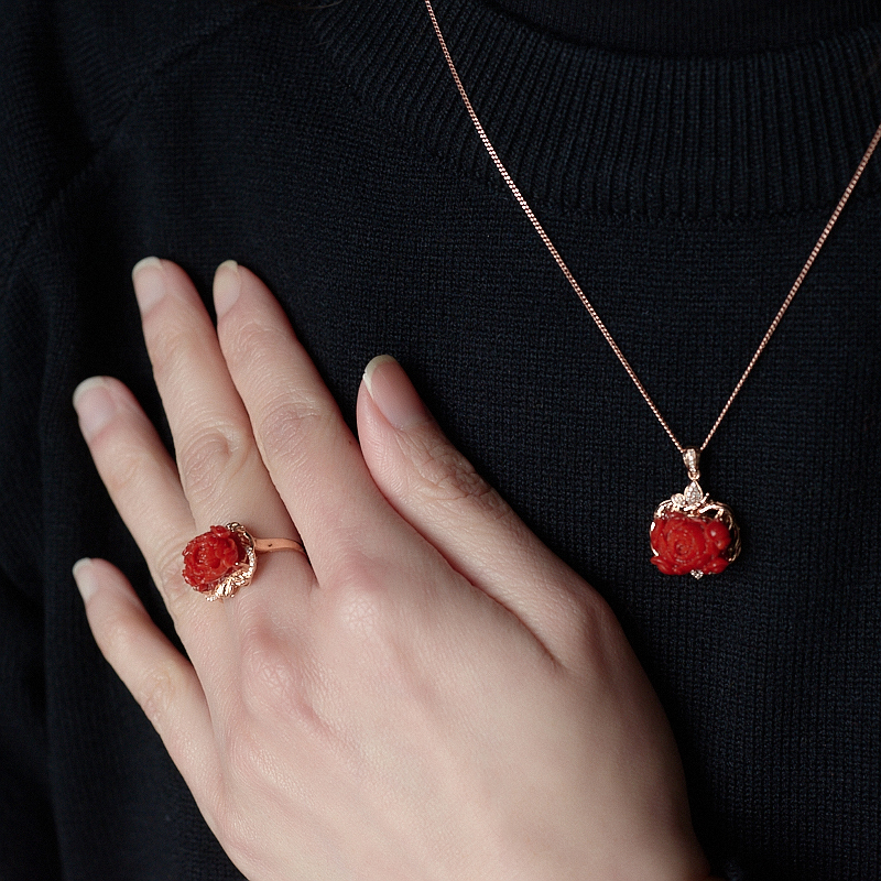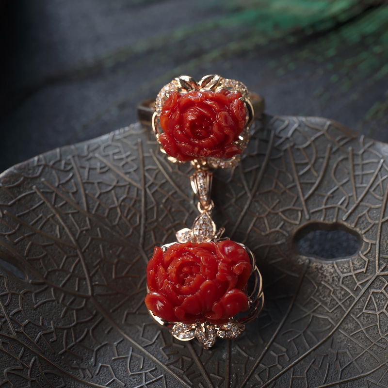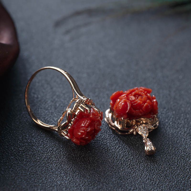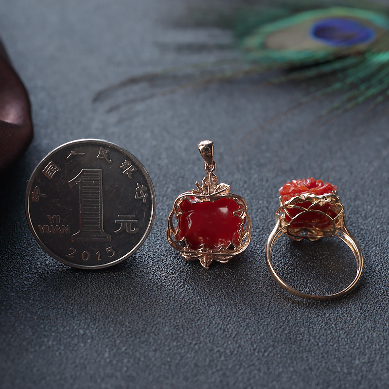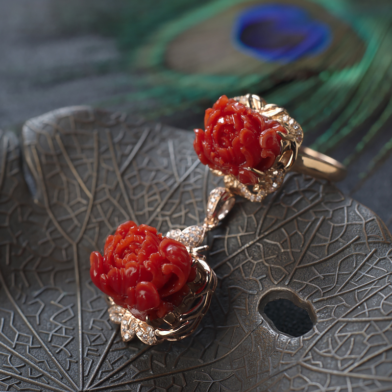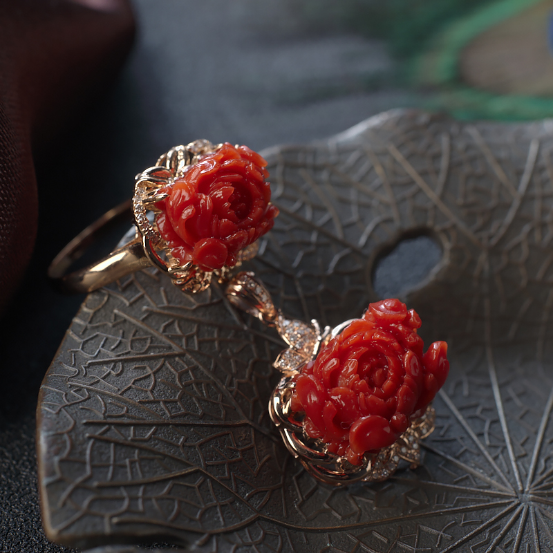 • 18K沙丁牛血红珊瑚花开富贵套装