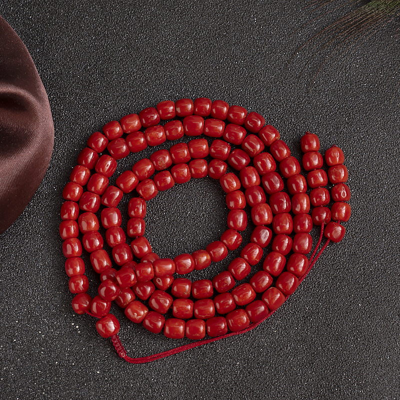 • 沙丁牛血红珊瑚桶珠108佛珠