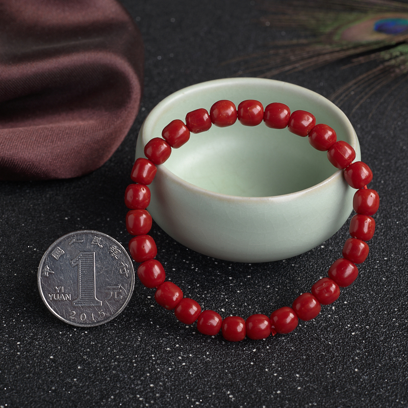 • 沙丁牛血红珊瑚桶珠单圈手串