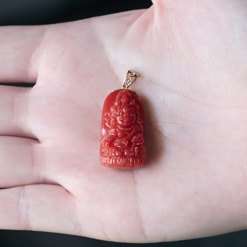 • 18K沙丁珊瑚黄财神吊坠