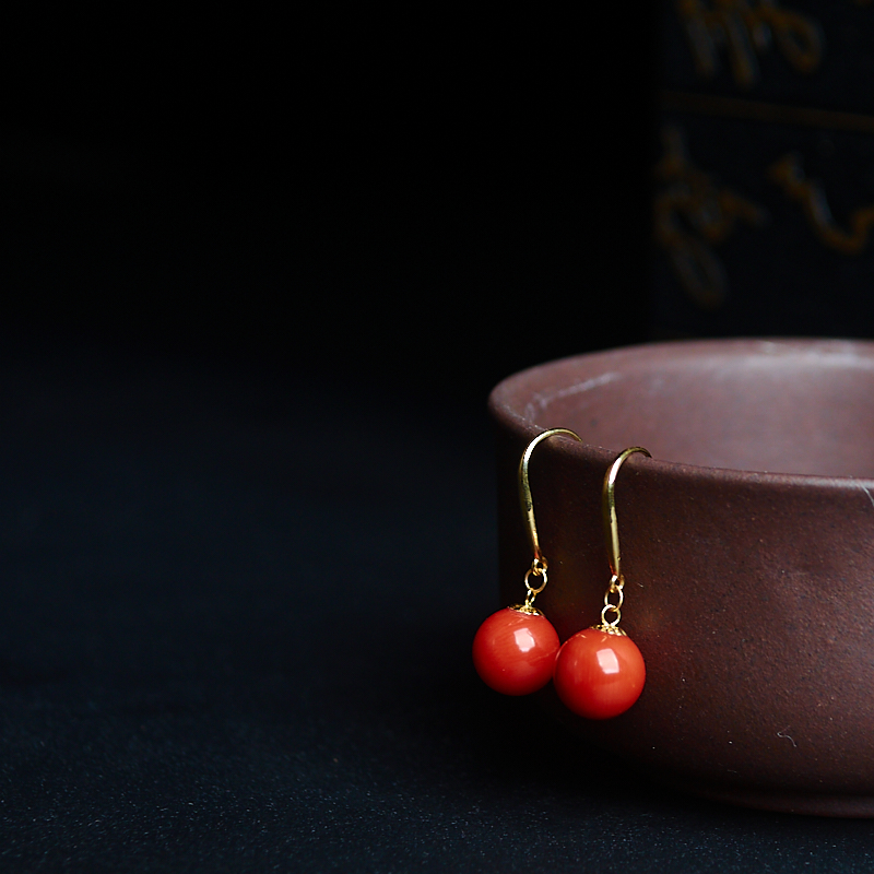 • 18K沙丁珊瑚圆珠耳环