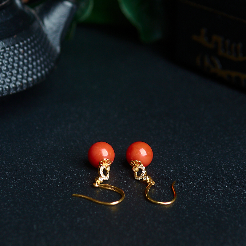 • 18K沙丁珊瑚圆珠耳环
