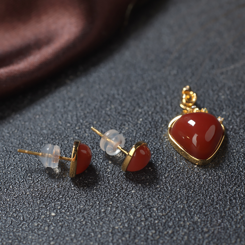 • 18K玫瑰红南红吊坠/耳钉套装