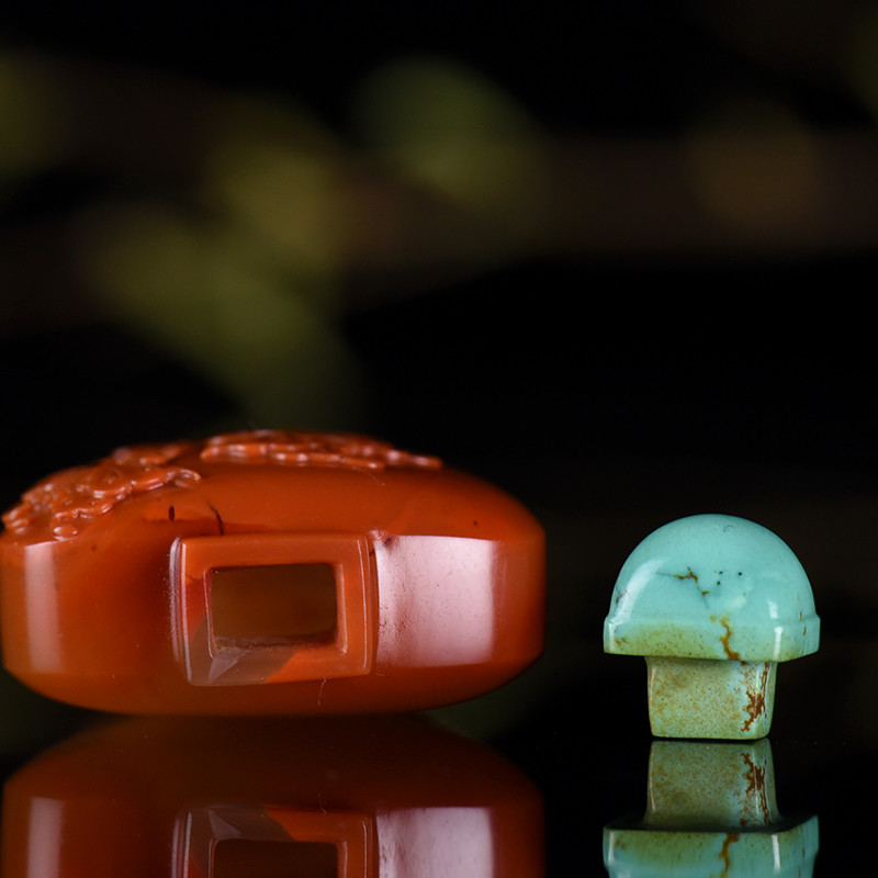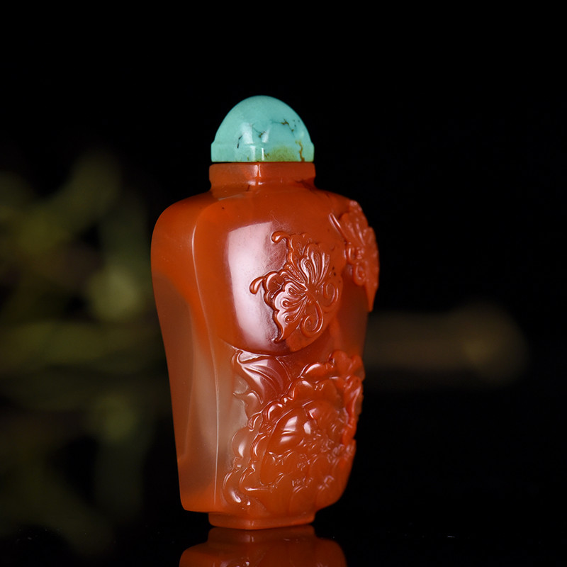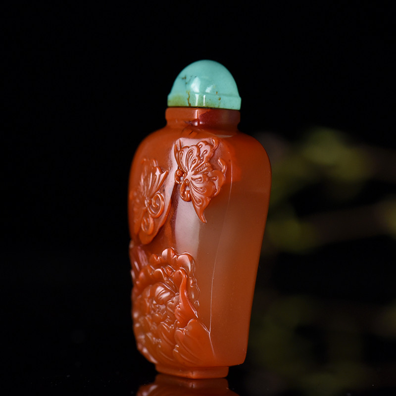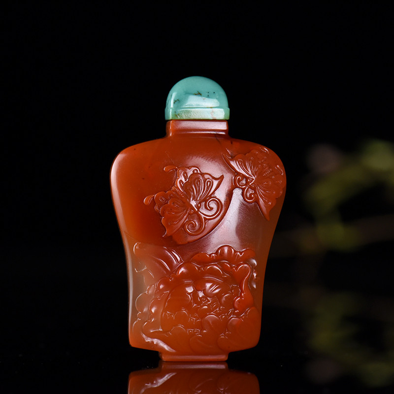 • 冰飘南红蝶恋花鼻烟壶手把件