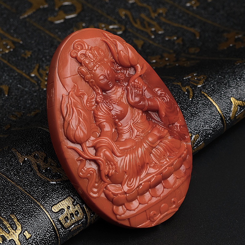 • [产品描述] 川料柿子红南红菩萨吊坠,肉质饱满,色泽浓郁,红艳瓷实,菩萨结跏趺坐于莲台上,头戴宝冠,身披璎珞,衣带飘飘如当风,手执莲花心眼显灵,宝相庄严魔邪莫敢近。吊坠画面构图和谐严谨,线条繁复而有致,菩萨仙逸绝尘,自在安详。