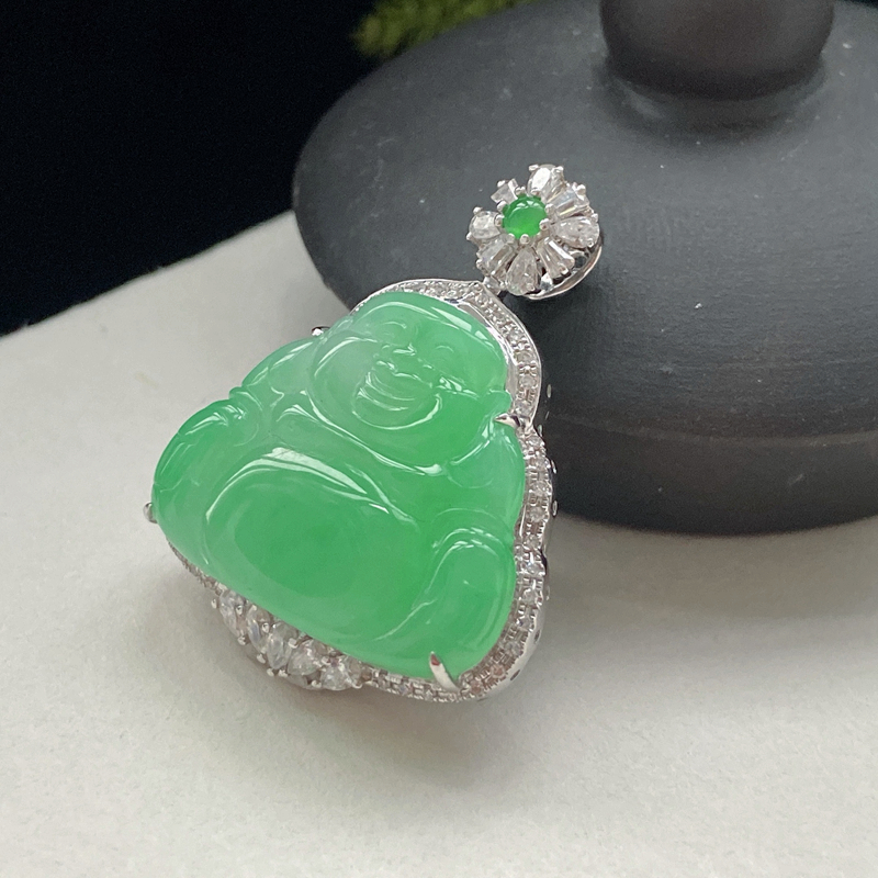 • 18K细糯种浅阳绿翡翠弥勒佛吊坠