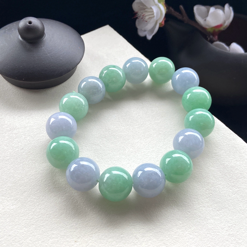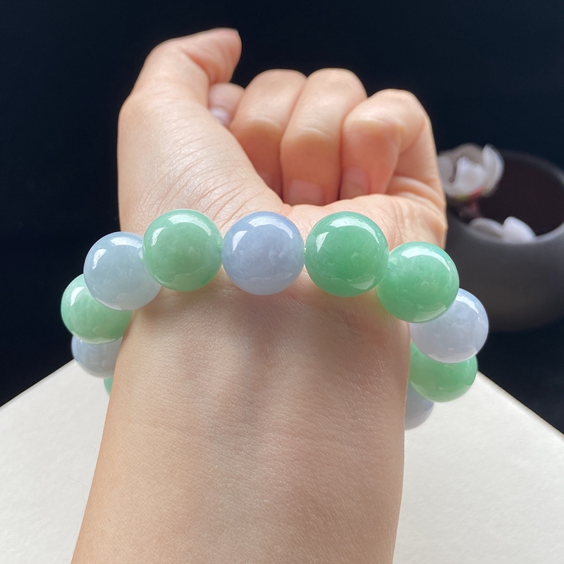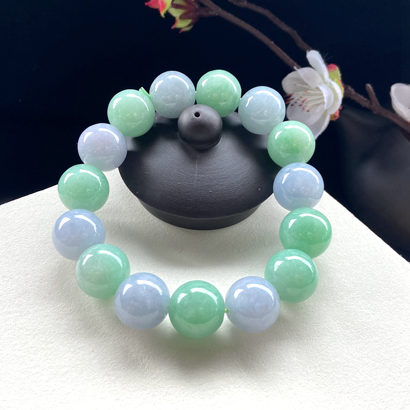 • [名  称] 14mm糯种春带彩翡翠单圈手串