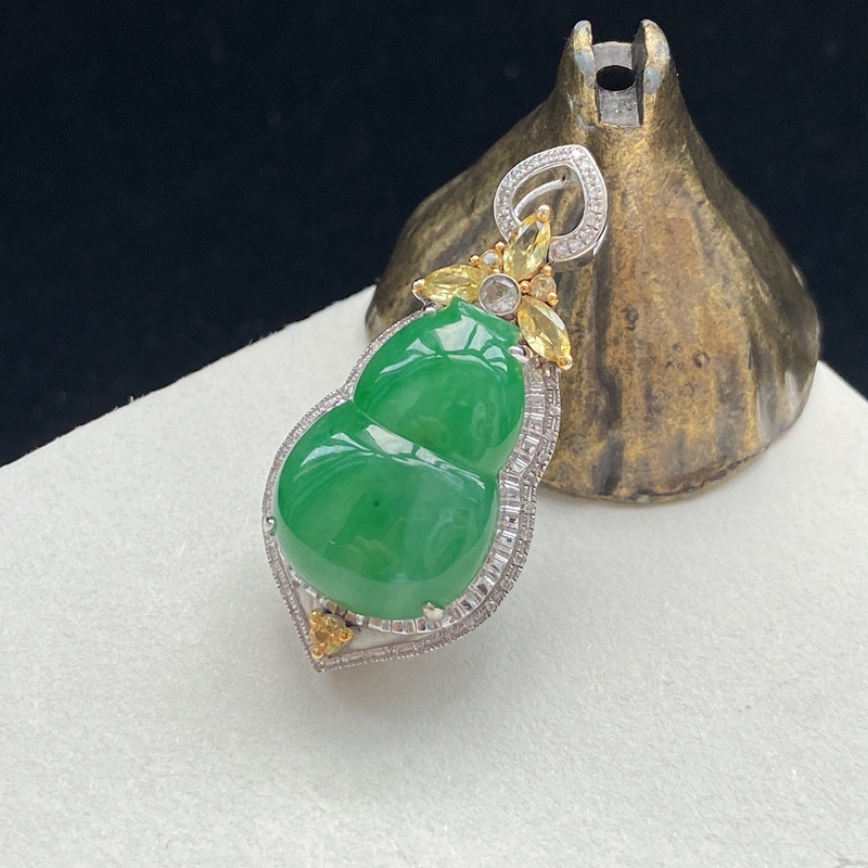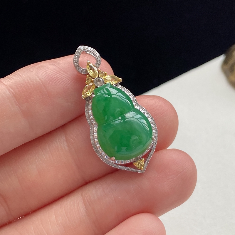 • 18K糯种豆绿色翡翠葫芦吊坠