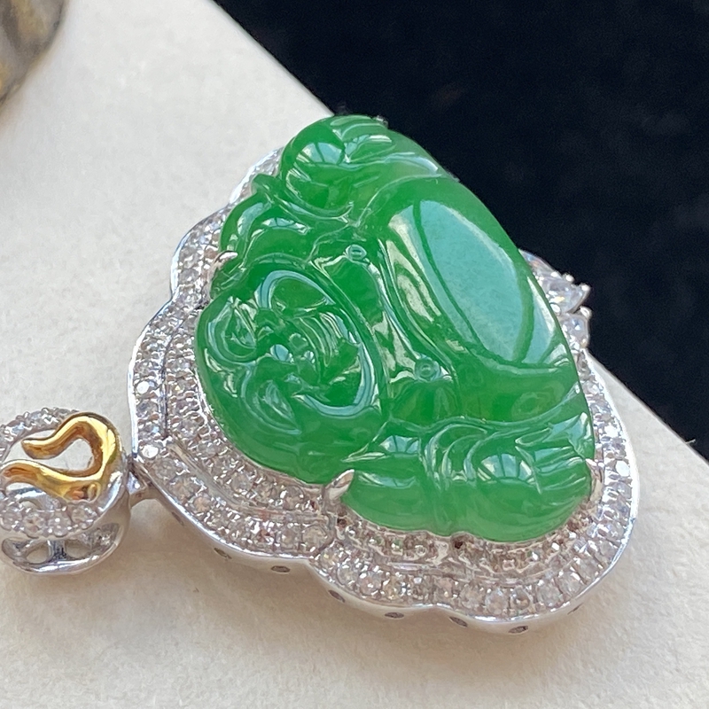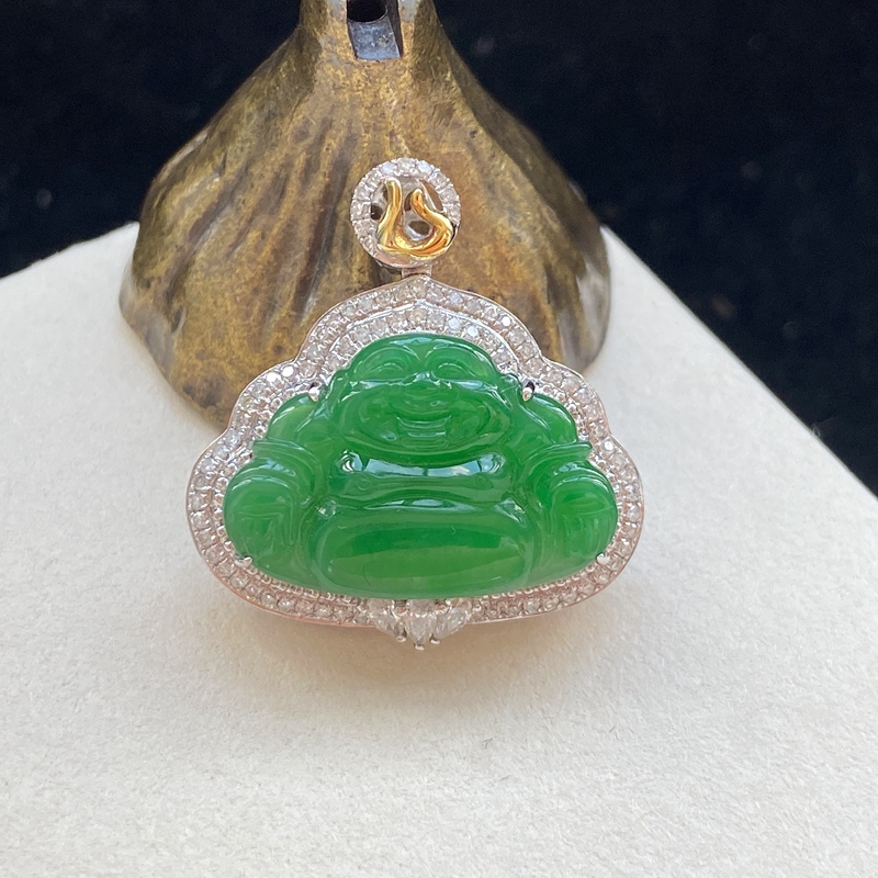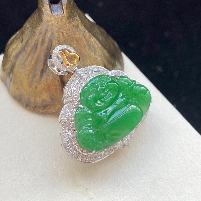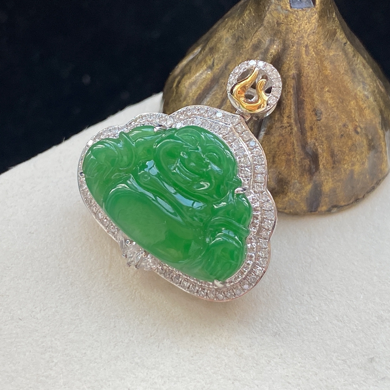 • 18K糯种翠绿翡翠弥勒佛吊坠