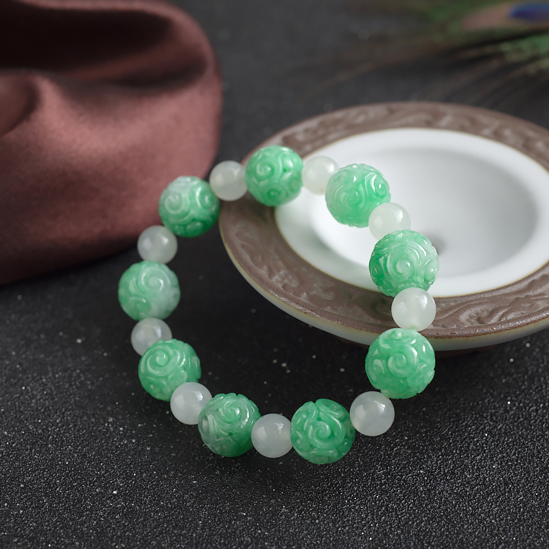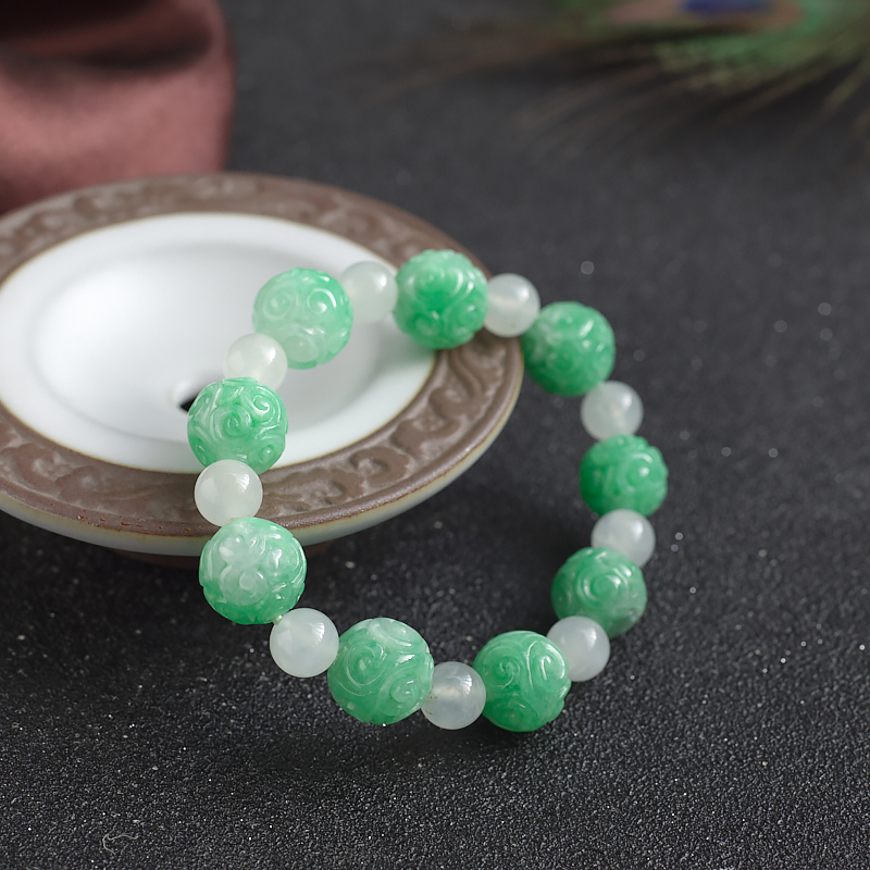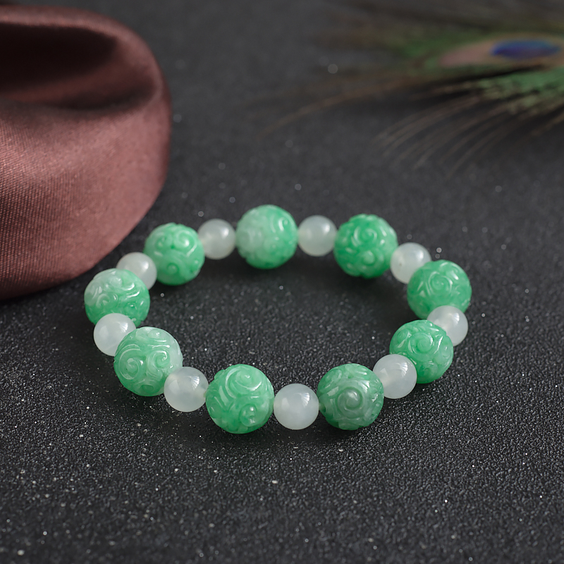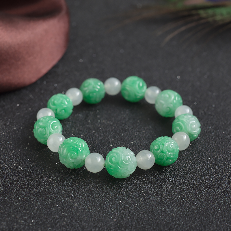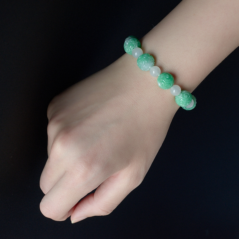 • 11mm糯种豆绿翡翠回纹珠单圈手串