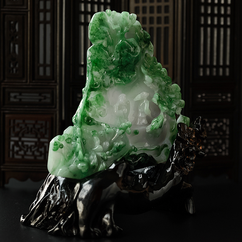 • 缅甸糯种飘绿翡翠问道摆件-红掌柜