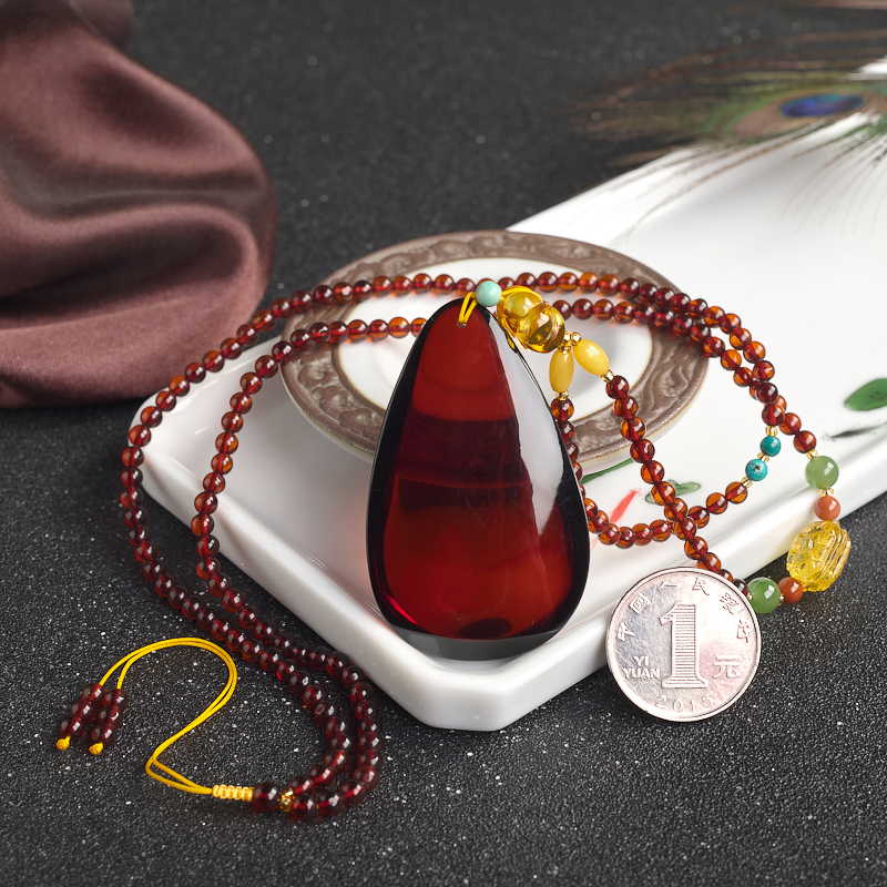 血珀珠径4mm,配链全长64cm,血珀珠数147颗